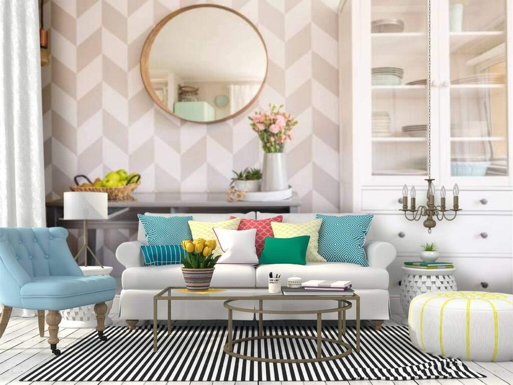 casa de color blanco con muebles de color beig con mesa en circulo.